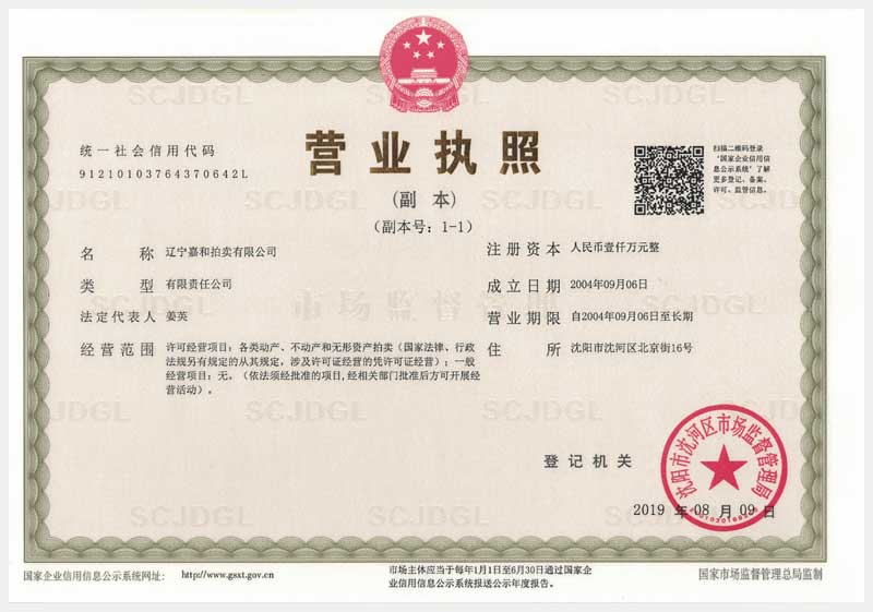 戶名:遼寧嘉和拍賣有限公司