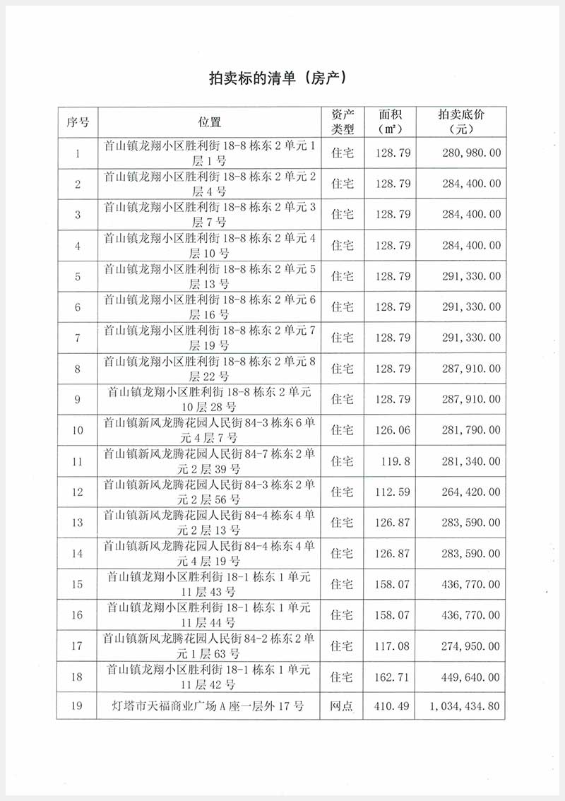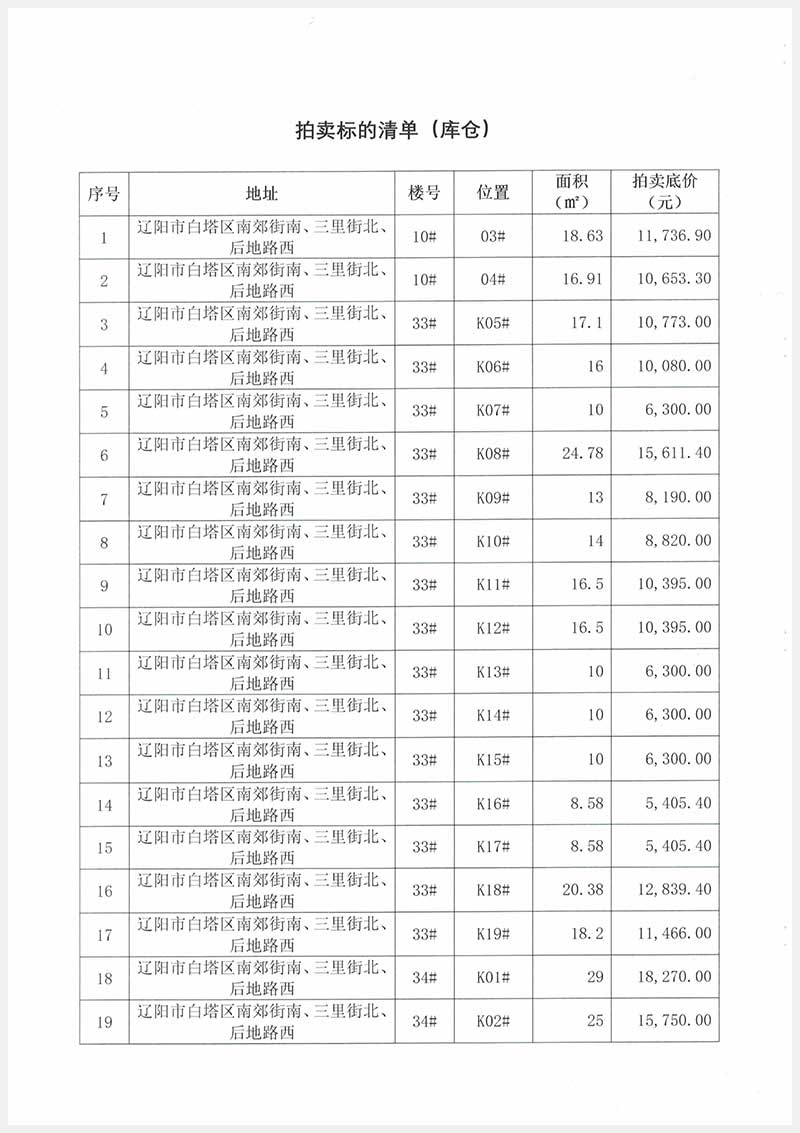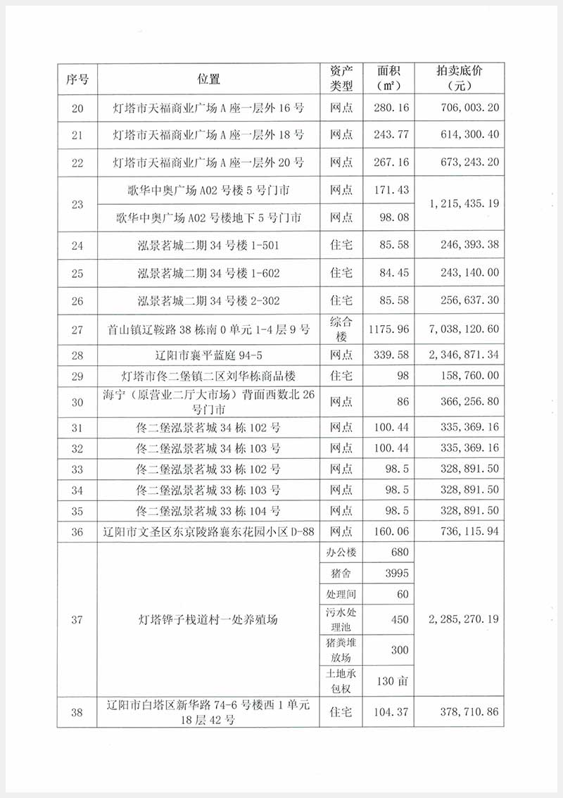 遼陽地區(qū)住宅、門市商網(wǎng)、綜合樓、養(yǎng)殖場、車庫、庫倉等共計100項資產(chǎn)(詳見附件)。